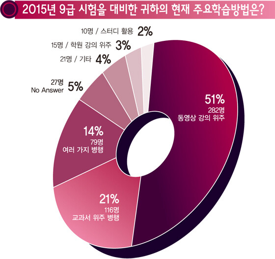‘내년 9급 시험을 대비한 귀하의 주요 학습패턴은?’이란 설문에 수험생들은 ▲동영상 강의 위주 51%(282명) ▲교과서 위주 21%(116명) ▲여러 가지 병행 14%(79명) ▲학원 강의 위주 3%(15명) ▲스터디 활용 2%(10명) 순으로 응답했다.