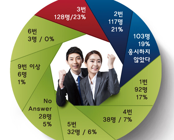 이어 ‘2번’이라고 응답한 수험생은 21%(117명)였으며, ‘1번’은 17%(92명)로 집계됐다. 즉 설문에 참여한 수험생 중 61%가 타 시험에 눈길을 돌리지 않은 것으로 나타났다.