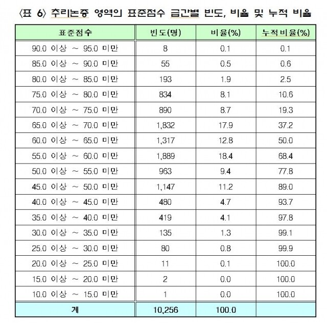 이어 “표준점수는 원점수에서의 상대적 서열을 반영한 점수로 원점수의 분포를 영역별로 정해진 평균과 표준편차를 갖도록 변환한 분포상에서 어느 위치에 해당하는 가를 나타내는 점수”라고 덧붙였다.