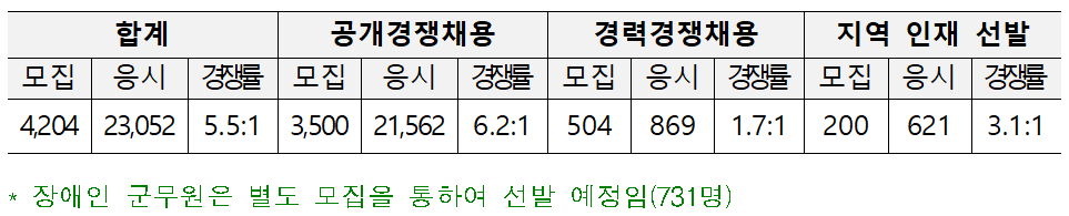 분야별로는 공개경쟁채용이 3,500명 모집에 21,562명이 몰려 경쟁이 가장 치열했고, 경력경쟁채용은 504명 모집에 869명이 응시해 1.7대 1, 지역인재 선발은 200명 모집에 621명이 지원해 3.1대 1의 경쟁률을 보였다. 이와는 별도로 장애인 군무원 731명도 별도 절차를 통해 선발할 계획이다.