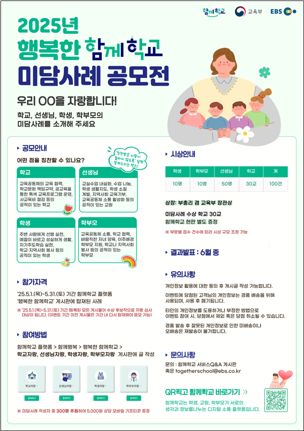 또한 함께학교 플랫폼에서는 ‘우리 ○○을 자랑합니다!’라는 주제로 교육공동체 미담사례 공모전이 진행된다. 이를 통해 교사뿐만 아니라 학생, 학부모, 학교 전체가 함께 만드는 존중과 공감의 교육 문화를 퍼뜨리는 데 힘을 보탠다. 교육부는 SNS를 통해 교사에 대한 감사 메시지를 담은 기획영상과 카드뉴스, 웹툰 형식 콘텐츠도 함께 선보였다.