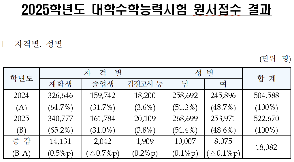 지원자 가운데 재학생은 37만1,897명으로 전년보다 3만1,120명(9.1%) 증가했다. 전체의 67.1%를 차지한다. 반면 졸업생은 15만9,922명으로 1,862명(1.2%) 줄었다. 검정고시 등 기타 지원자는 2만2,355명으로 2,246명(11.2%) 늘었다.