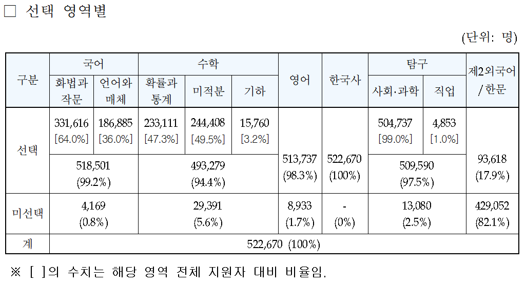 국어 영역(응시율 99.0%)에서는 화법과 작문(68.4%)이 언어와 매체(31.6%)보다 많았고, 수학 영역(응시율 94.0%)에서는 확률과 통계(57.1%)가 가장 많이 선택됐다.