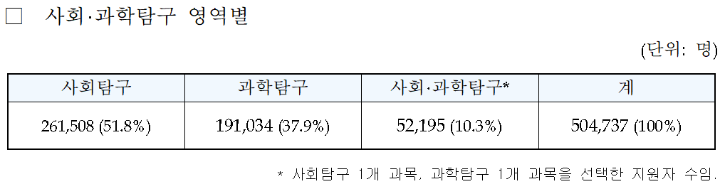 탐구 영역에서는 사회탐구만 택한 수험생이 32만4,405명(61.0%), 과학탐구만 택한 수험생은 12만692명(22.7%)이었다. 사회·문화(49.4%)와 지구과학Ⅰ(21.7%)이 각각 최다 선택 과목이었다. 직업탐구 응시자 4,924명 중 96.4%는 ‘성공적인 직업생활’을 골랐다.
