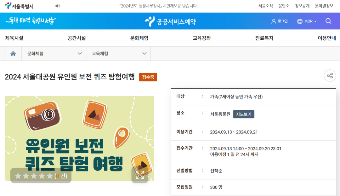 사전 예약은 추선 연휴 마지막 날인 9월 13일(금) 오후 2시부터 서울시 공공서비스 예약 누리집을 통해 가능하다. 프로그램은 30~40분 정도 소요되며, 유인원관을 탐험하며 도전 과제를 수행하는 놀이형 학습으로 진행된다.