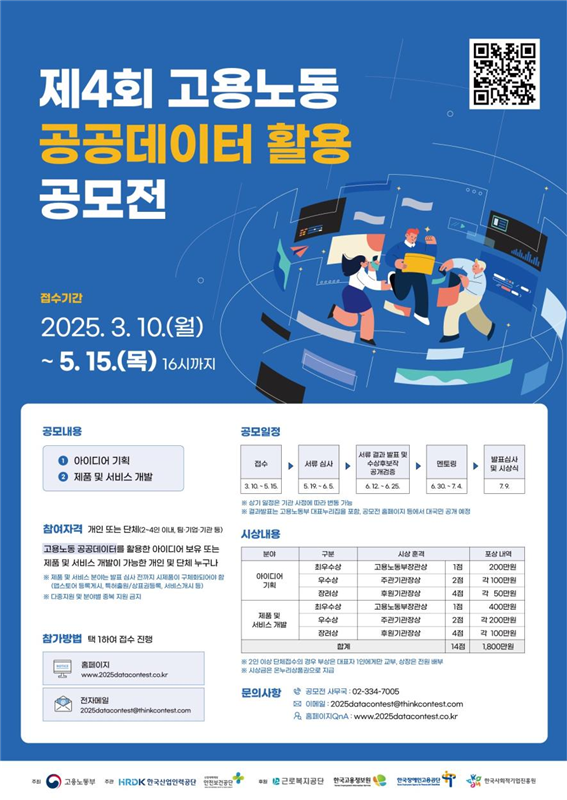 [피앤피뉴스=마성배 기자] 공공데이터를 활용한 혁신적인 아이디어와 서비스를 발굴하기 위한 ‘제4회 고용노동 공공데이터 활용 공모전’이 열린다. 한국산업인력공단(이사장 이우영)과 한국산업안전보건공단(이사장 김현중)이 공동 주최하는 이번 공모전은 3월 10일(월)부터 5월 15일(목)까지 응모작을 접수받는다.
