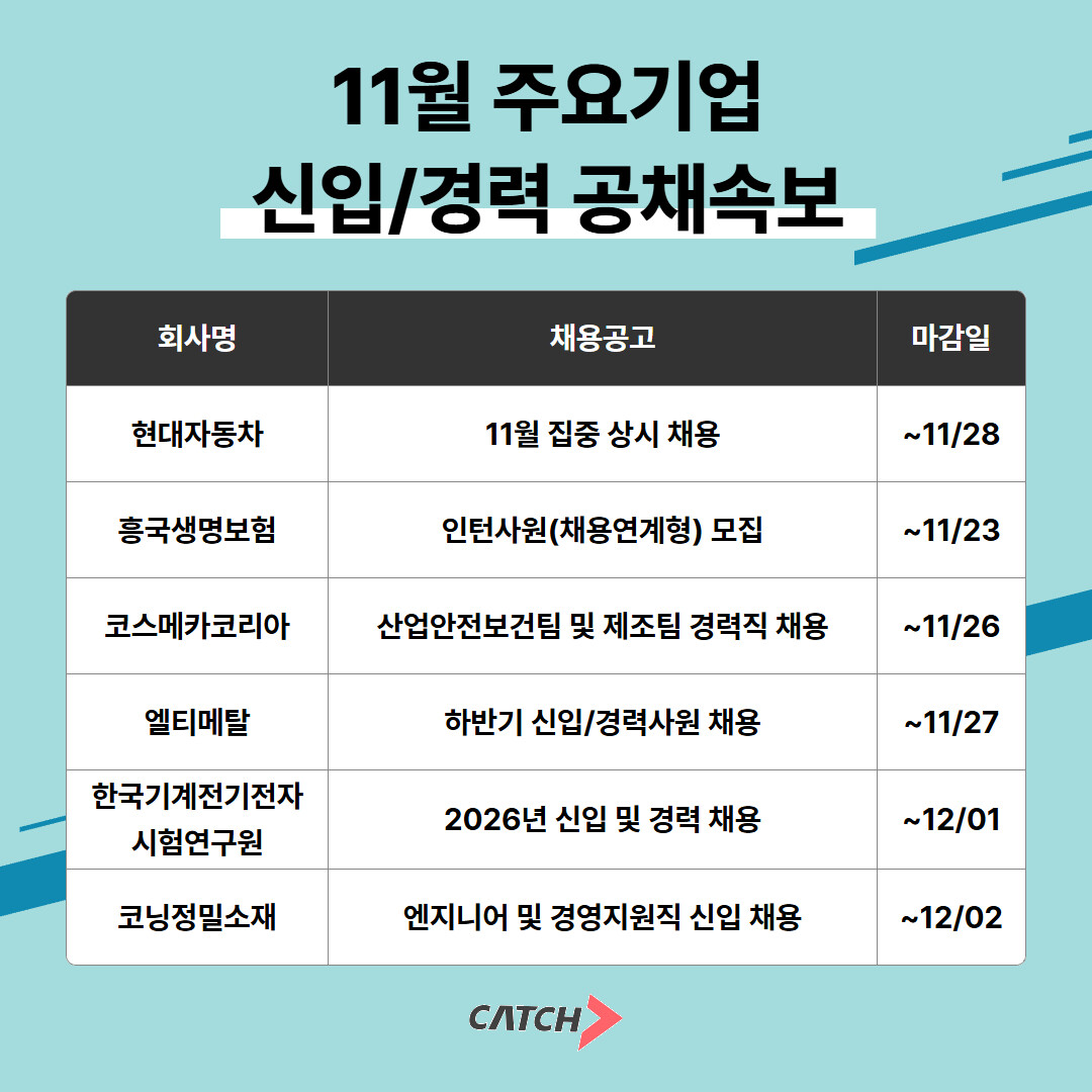 [피앤피뉴스=마성배 기자] 채용 플랫폼 진학사 캐치는 17일 11월 들어 주요 기업들이 신입과 경력, 인턴을 대거 모집하며 채용 시장이 본격적으로 열리고 있다고 전했다. 이번 공고에는 현대자동차, 흥국생명보험, 코스메카코리아, 엘티메탈, 한국기계전기전자시험연구원, 코닝정밀소재 등 6개 기업이 포함됐다.