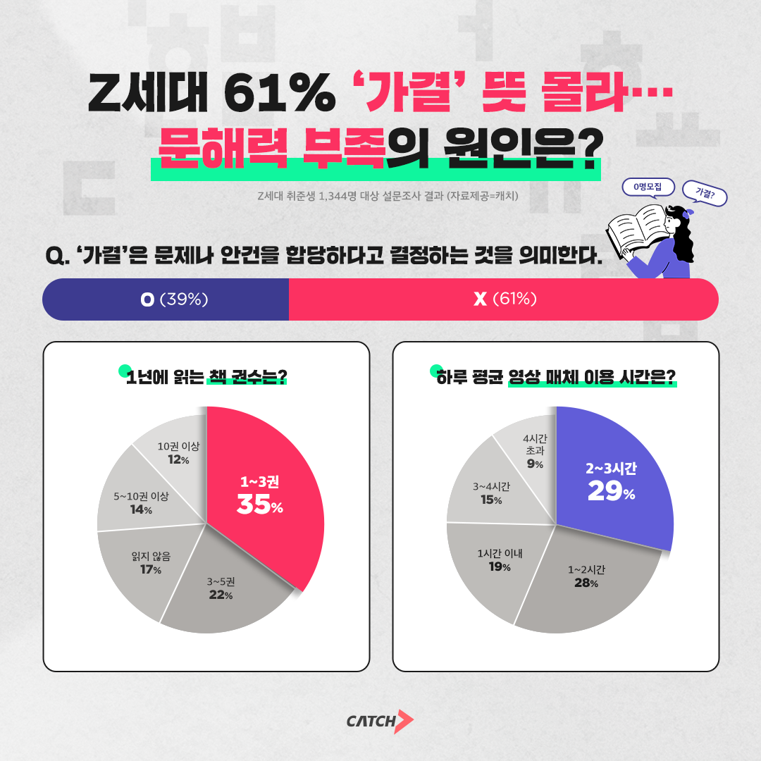 그러나 실제 문해력 테스트 결과는 달랐다. '가결'의 뜻을 묻는 문항에서 정답을 맞힌 응답자는 39%에 불과했다. ‘이지적이다’, ‘북침’, ‘무운’, ‘결재’, ‘가결’, ‘모집인원: 0명’ 등의 6가지 문항 중 모든 정답을 맞힌 응답자는 28%에 그쳤다.