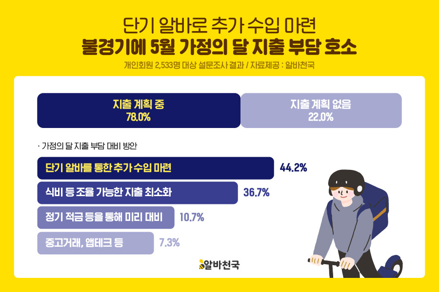 구인구직 포털 알바천국이 10대부터 50대 이상 개인회원 2,533명을 대상으로 실시한 설문조사 결과, 전체 응답자의 78.0%가 가정의 달 관련 소비 계획이 있다고 밝혔지만 이는 지난해(81.3%)보다 소폭 감소한 수치다. 반대로 ‘전혀 지출할 계획이 없다’고 응답한 비율은 22.0%로 전년 대비 3.3%p 증가했다.