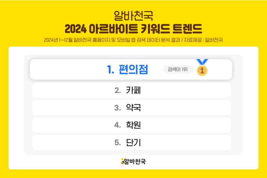 [피앤피뉴스=마성배 기자] ‘알바천국’이 발표한 ‘2024 아르바이트 키워드 분석’에 따르면, 가장 많이 검색된 키워드는 지난해에 이어 ‘편의점’이 부동의 1위를 기록했다. 이어 카페(2위), 약국(3위), 학원(4위) 등이 인기 업종으로 이름을 올리며 꾸준한 수요를 증명했다.