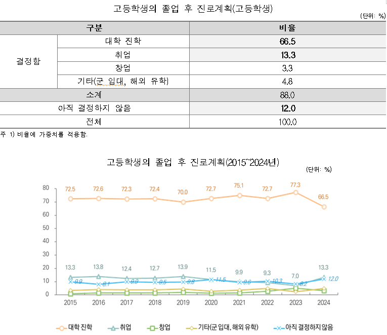 고등학생의 졸업 후 진로계획 조사 결과, 대학 진학 희망 비율은 지난해 77.3%에서 올해 66.5%로 감소하며 큰 변화를 보였다. 반면, 취업 희망 비율은 7.0%에서 13.3%로 상승했다. 창업을 희망하는 비율은 3.3%로 소폭 하락했지만, 창업가정신 함양 교육과 창업체험 활동을 경험한 학생들은 진로 개발 역량에서 긍정적인 성과를 보였다.