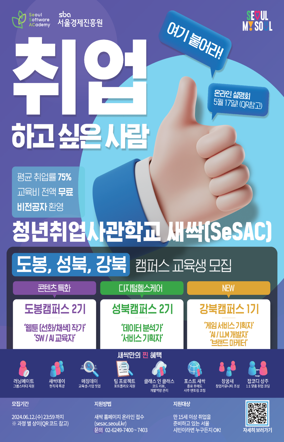 이번에 모집하는 도봉·성북·강북 캠퍼스의 SW/DT 분야 7개 교육과정은 콘텐츠, 디지털 헬스케어, 게임 서비스 기획 및 AI/LLM 개발자 등 다양한 과정으로 구성되며, 취업 의지가 있는 만 15세 이상의 서울시민은 누구나 ‘청년취업사관학교 새싹’ 누리집을 통해 신청할 수 있다.