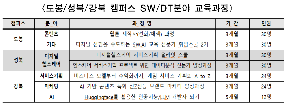 도봉캠퍼스에서는 현직 웹툰 작가진의 강의와 멘토링을 받을 수 있는 ‘웹툰 제작사(선화/채색) 과정’ 및 ‘SW/AI 교육 전문가 취업스쿨 2기’ 과정을 운영하며, 교육비는 전액 무료로 진행한다.