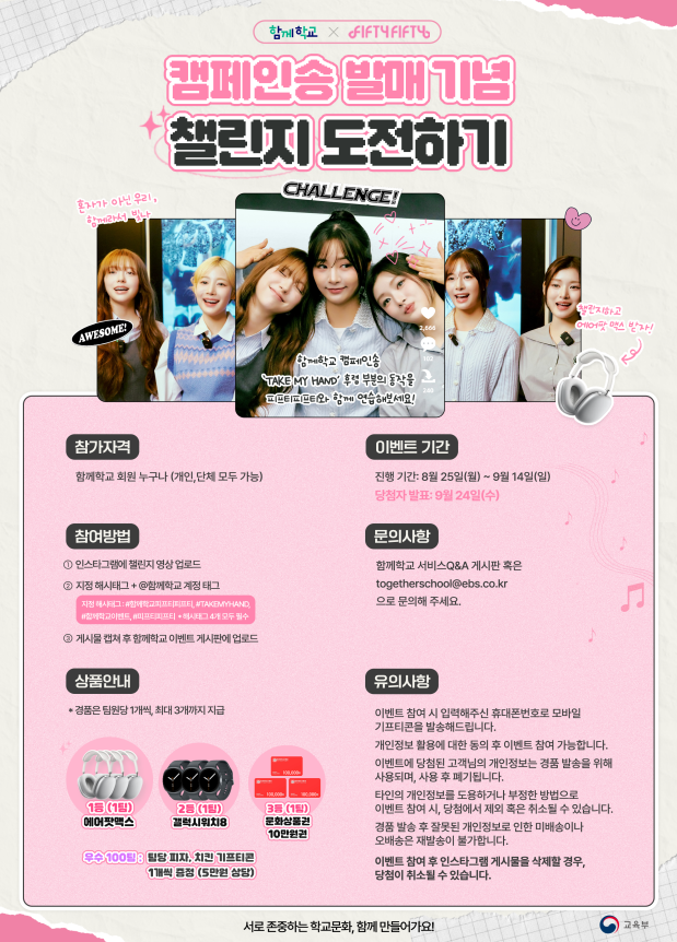 [피앤피뉴스=마성배 기자] 교육부와 한국교육방송공사가 22일 세종컨벤션센터에서 ‘함께학교 미담사례 공모전 시상식’을 열고, 케이팝 그룹 피프티피프티와 함께 제작한 캠페인 송 「Take My Hand(내 손을 잡아요)」를 공개한다.