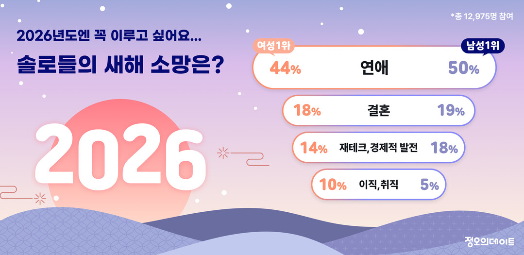 조사에 따르면 남성 응답자의 절반인 50%, 여성 응답자의 44%가 2026년 새해 가장 이루고 싶은 소망으로 ‘연애’를 선택했다. 단일 항목 가운데 가장 높은 응답률로, 성별을 불문하고 미혼남녀가 새해에 가장 절실히 바라는 목표가 연애인 것으로 드러났다.