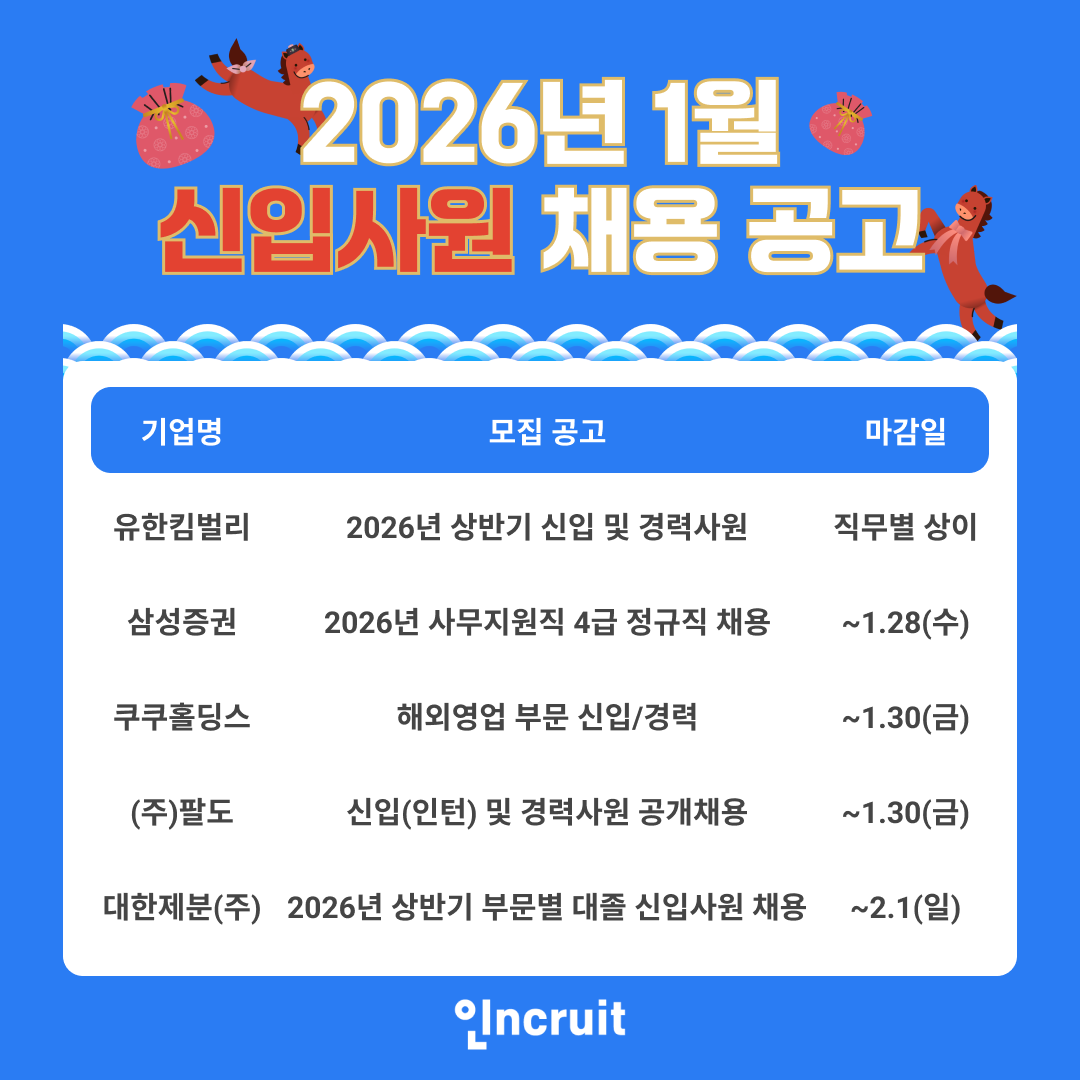 [피앤피뉴스=마성배 기자] 새해 취업을 목표로 한 구직자들에게 1월은 사실상 상반기 채용의 출발선이다. HR테크 기업 인크루트는 2026년 상반기 취업을 준비하는 구직자들을 위해 주요 기업들의 1월 신입·경력 채용 공고를 소개하며 전략적인 지원 준비를 당부했다.