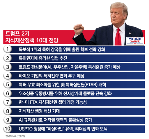 [피앤피뉴스=마성배 기자] 트럼프 2기 행정부가 출범하면서 세계 경제와 지식재산 정책에 대한 불확실성이 커지고 있다. 이에 한국지식재산연구원은 트럼프 행정부의 1기 정책과 대선 공약 등을 분석한 보고서를 통해 향후 미국의 지식재산 정책 방향을 전망했다.