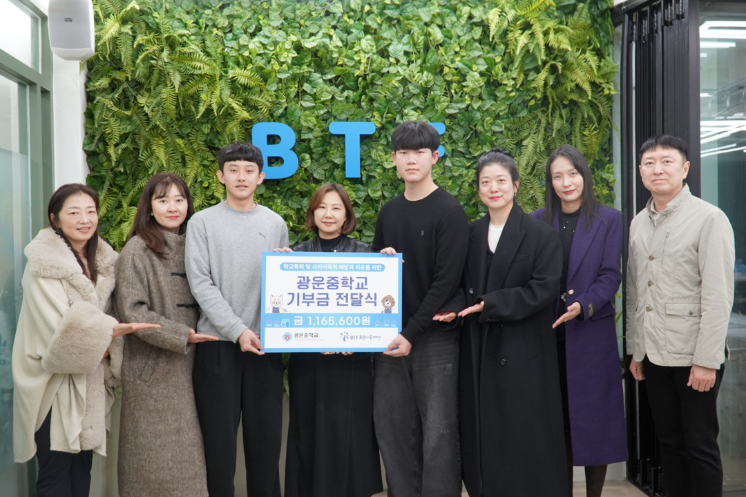 광운중학교는 지난 2월 12일 BTF푸른나무재단에서 기부금 전달식을 열고, 학교폭력 피해 청소년의 치유·회복과 예방 활동을 위해 학생들이 모은 수익금을 전달했다고 밝혔다. 이날 전달식에는 광운중학교 학생회와 학부모회 대표, 교직원 대표가 함께 참석해 의미를 더했다.