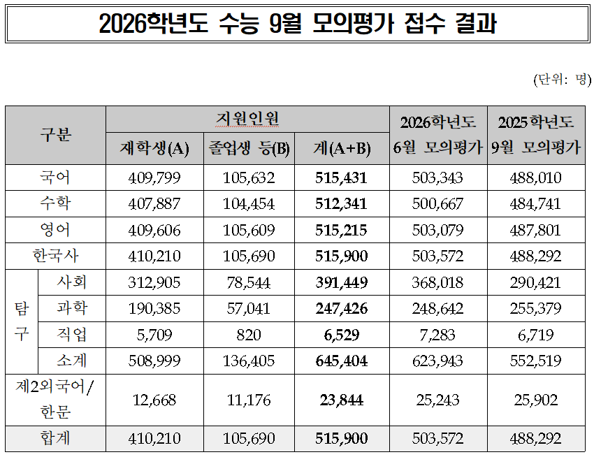 이번 모의평가 응시자는 총 51만 5,900명으로, 이 중 재학생은 41만 210명, 졸업생 등은 10만 5,690명이다. 이는 지난 6월 모의평가보다 1만 2,328명 증가한 수치로, 재학생은 다소 줄었지만 졸업생 응시자가 크게 늘면서 전체 규모가 확대됐다. 작년 같은 기간보다도 2만 7,608명이 늘어 역대 최대치를 기록했다.