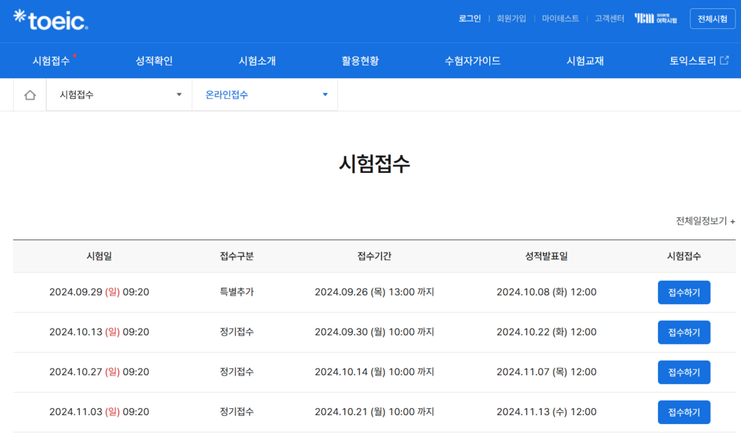 또한 토익 홈페이지에서는 9월 29일(일), 10월 13일(일), 10월 27일(일), 11월 3일(일) 시험 접수가 진행 중이다.