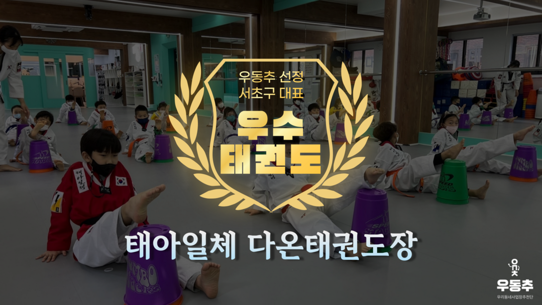 태아일체 다온태권도장은 우리동네사업장추천단(이하 우동추)이 선정한 '서초구 방배동 대표 우수태권도장'에 선정됐다고 밝혔다. 이는 서초구 전체 태권도장 중 우수한 교육기관임을 공식 인증받은 것이다.