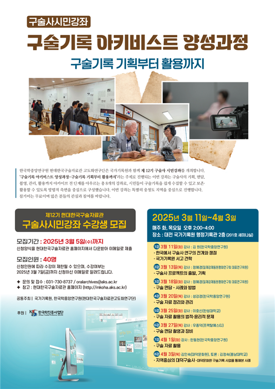 한국학중앙연구원(원장 김낙년)과 행정안전부 국가기록원은 오는 3월 11일부터 4월 3일까지 매주 화·목요일, 대전 국가기록원 행정기록관에서 ‘2025년 구술사 시민강좌’를 개최한다고 밝혔다.
