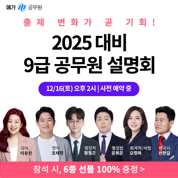 [피앤피뉴스=마성배 기자] 메가스터디교육이 운영하는 공무원 시험 전문 브랜드 ‘메가공무원’이 12월 16일 토요일 오후 2시 노량진 메가스터디타워에서 2025 9급공무원 시험 대비 합격전략 설명회를 개최한다.