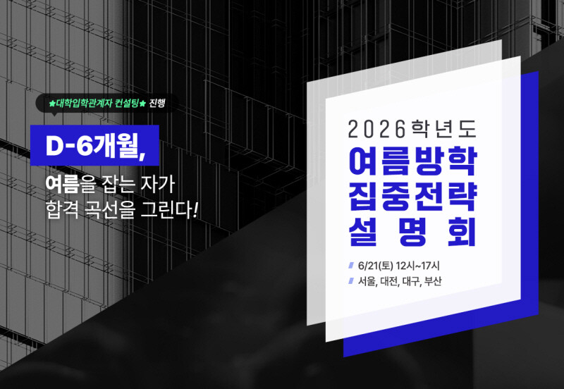 2026학년도 대학편입 여름방학 집중전략 설명회는 오는 6월 21일(금) 12시부터 17시까지 서울과 대전, 대구, 부산에서 진행된다. 서울은 코엑스 컨퍼런스 E에서 ▷13시: 상위권/인서울, 연고대, 경찰대, 미대 ▷15시: 상위권/인서울, 의약대 등의 설명회가 진행된다. 대전과 대구, 부산은 각 캠퍼스에서 ▷12시: 의약대 ▷15시: 상위권/인서울 등의 설명회가 진행된다.