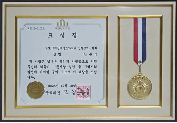 중산그룹 장종식 대표는 장애인 문화예술 활성화와 지역사회 공헌에 기여한 공로를 인정받아 국회 표창장을 수상했으며, 이번 표창은 민간 차원에서 장애인의 문화적 권익 신장과 사회 참여 확대를 위해 지속적인 노력을 기울여온 공로를 공식적으로 인정받은 결과라고 전했다.