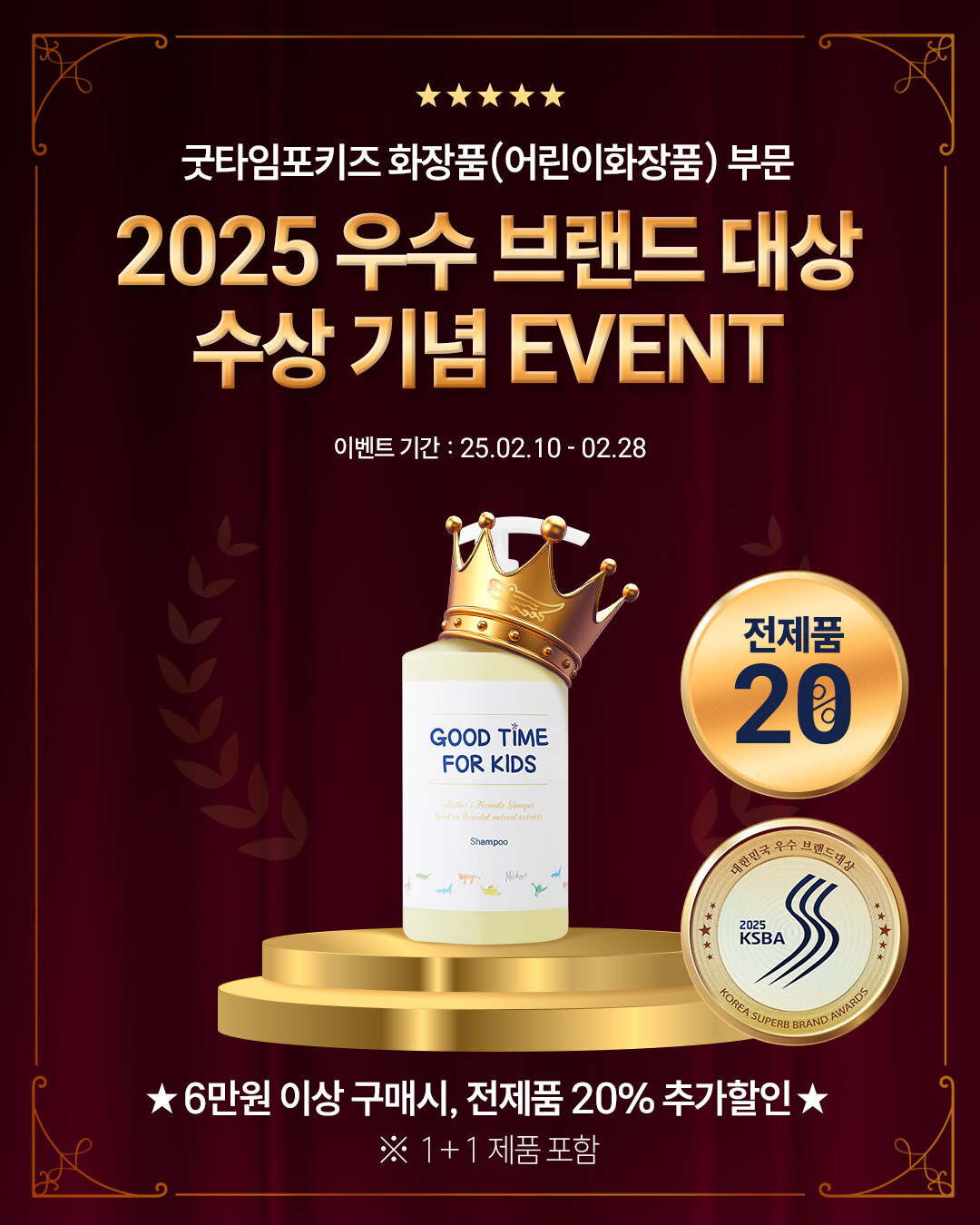 굿타임포키즈가 2025 우수 브랜드 - 화장품(어린이 화장품) 부문에 대상을 수상하였다. 이에 따라 고객님들께 감사의 마음을 전하고자 특별한 이벤트를 진행한다. 이벤트는 오늘부터 이달 말까지 진행된다.