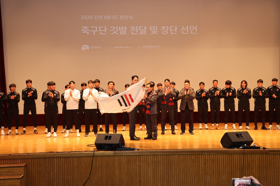 ▲진천HR FC 창단식에서 신호룡 단장 겸 구단주(왼쪽)와 송기섭 진천군수(오른쪽)가 구단 깃발을 흔들며 공식 출범을 선언하자, 선수단과 참석자들이 박수로 새로운 출발을 축하하고 있다./사진=HR레포츠 미디어팀 제공