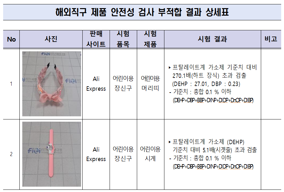 검사 결과, 어린이용 머리띠 1개와 시계 1개에서 프탈레이트계 가소제(DEHP, DBP)가 검출됐다. 어린이용 머리띠에서는 DEHP와 DBP가 기준치 대비 최대 270배 초과했고, 어린이용 시계에서는 DEHP가 기준치를 5배 초과해 검출됐다.