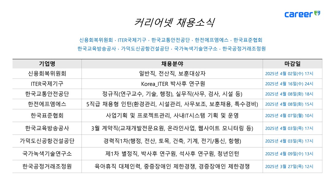 [피앤피뉴스=마성배 기자] 취업포털 커리어는 27일, 신용회복위원회를 비롯해 ITER국제기구, 한국교통안전공단, 한전에프엠에스, 한국표준협회, 한국교육방송공사(EBS), 가덕도신공항건설공단, 국가녹색기술연구소, 한국공정거래조정원 등 주요 기관의 2025년 상반기 채용 소식을 발표했다. 이번 채용은 정규직·계약직·인턴 등 다양한 고용 형태와 직무 분야로 이뤄져 구직자들의 관심을 끌고 있다.
