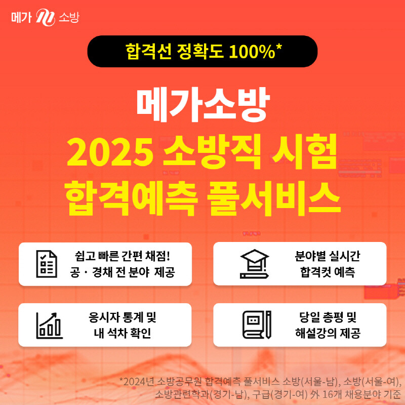 이와 더불어 시험 당일 저녁 7시부터 메가소방 심승아(소방학/관계법규), 곽동진(소방학/관계법규), 유휘운(행정법), 임재희(응급처치학개론) 등 대표 강사들이 나와 과목별 난이도 분석 및 예상 합격컷에 대해 살펴보고 소방 시험 최종 합격에 필요한 전략을 공개하는 ‘소방직 총평 라이브’ 방송이 진행될 예정이다. 2025 메가소방 합격예측 풀서비스와 관련된 자세한 사항은 메가소방 홈페이지에서 확인할 수 있다.