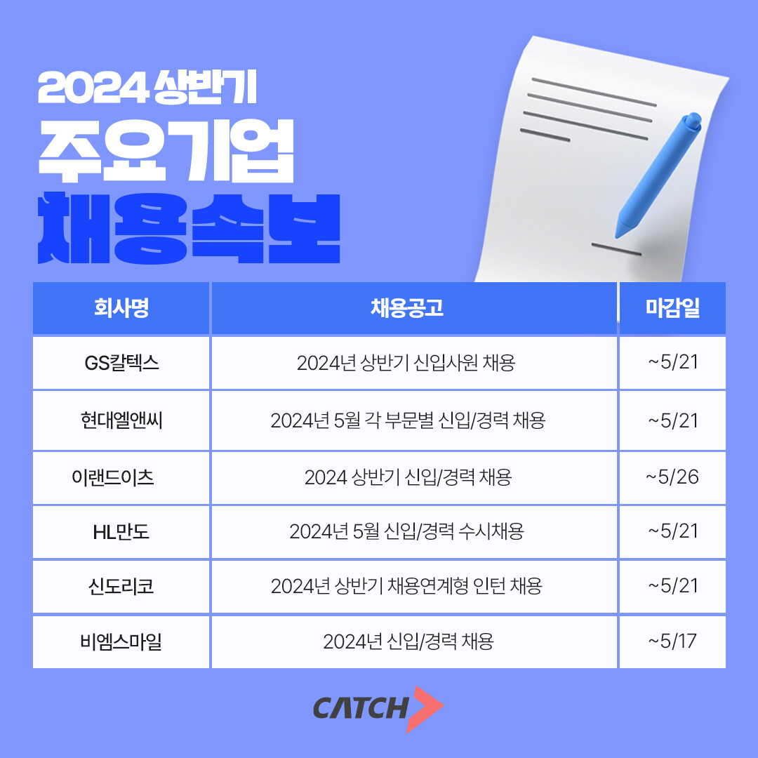 [피앤피뉴스=마성배 기자] 진학사 캐치는 9일 GS칼텍스, 현대엘앤씨, 이랜드이츠, HL만도, 신도리코, 비엠스마일 등이 채용 문을 넓혀 다양한 직군에서 새로운 인재들을 모집 중이라고 밝혔다.
