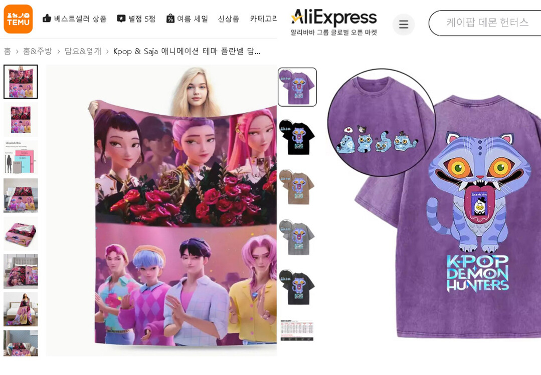 최근 ‘알리익스프레스’와 ‘테무’ 등 글로벌 전자상거래 플랫폼에는 케데헌의 이미지와 로고를 무단 사용한 티셔츠, 가방, 인형, 담요 등 각종 상품이 버젓이 판매되고 있다. 공식 제작사와 무관한 불법 제품임에도 전 세계 소비자를 대상으로 손쉽게 거래가 이뤄지고 있는 것이다.