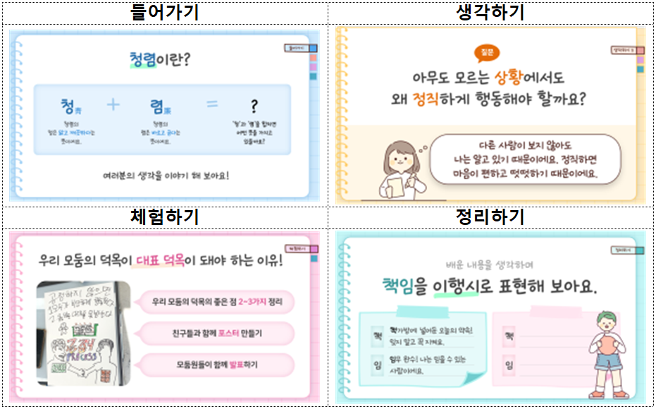 이번 프로그램은 단순 강의가 아닌 ‘질문–생각–체험–정리’ 4단계 수업 방식으로 진행된다. 예를 들어 동화 속 상황을 토대로 생각을 나누고, 만들기·놀이 활동으로 핵심 덕목을 익힌 뒤, 스스로 정리하는 과정을 거치도록 구성됐다.