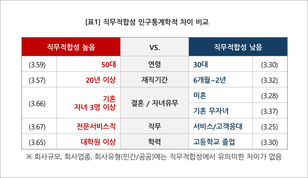 또한 자녀 수가 많을수록 직무적합성이 높게 나타난 점도 주목된다. 연구진은 가족 부양에 대한 책임감이 직무 몰입으로 이어지고, 안정성을 중시하는 태도로 연결된 결과라고 해석했다.