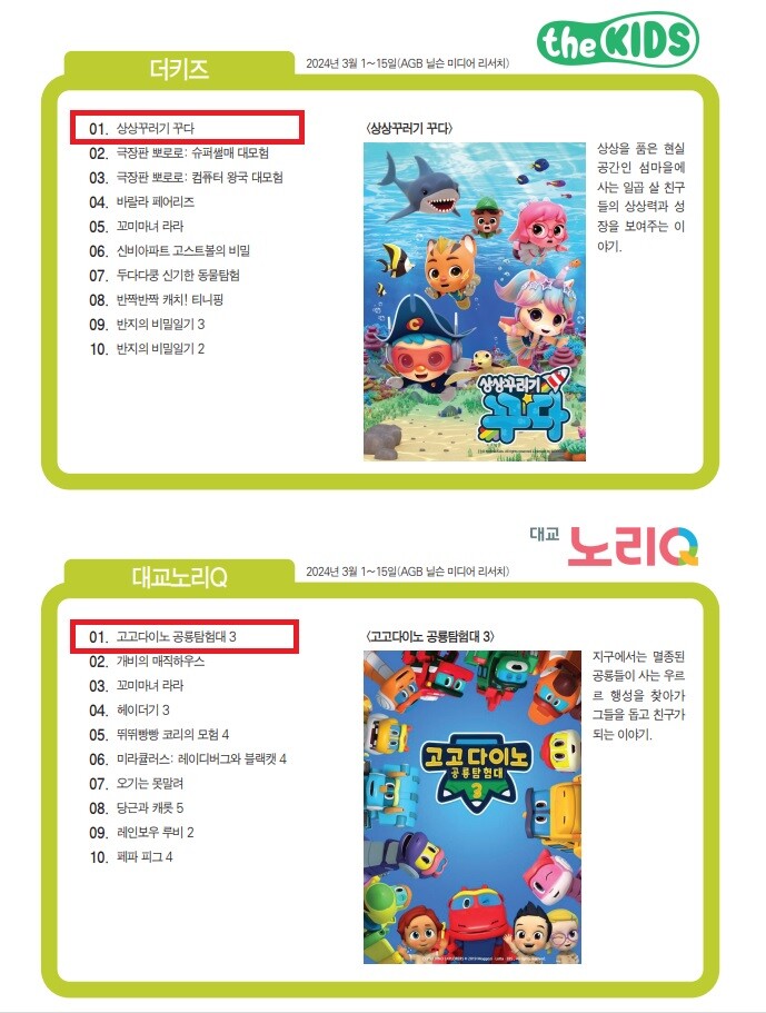 모꼬지 애니메이션 고고다이노-상상꾸러기 꾸다, 케이블 애니 3월시청률 1위