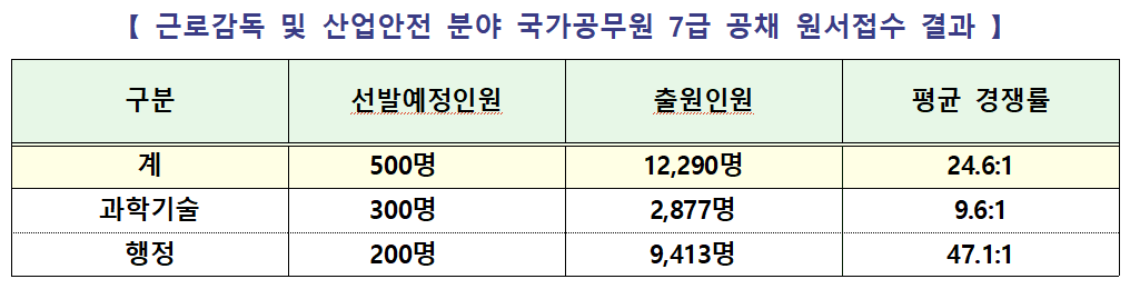 [피앤피뉴스=마성배 기자] 2025년도 근로감독 및 산업안전 분야 국가공무원 7급 공개경쟁채용시험 최종 원서접수 결과, 500명 선발에 1만2,290명이 지원해 평균 24.6대 1의 경쟁률을 기록했다.