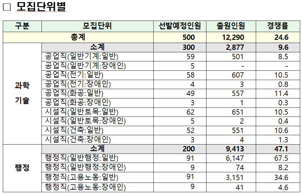 반면 일부 장애인 구분 모집은 정원을 채우지 못했다. 공업(일반기계·장애인)은 지원자가 없었고, 공업(전기·장애인)은 4명 선발에 3명, 공업(화공·장애인)은 3명 선발에 1명, 시설(일반토목·장애인)은 5명 선발에 2명만 지원했다. 행정(일반행정·장애인)은 9명 모집에 74명, 행정(고용노동·장애인)은 9명 모집에 41명이 지원했다.