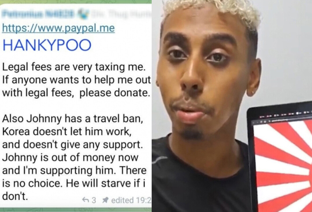 ▲사진 : 조니 소말리 관련 기부 구걸중인 페이팔 계정(좌)과 조니 소말리가 욱일기를 들고 있는 장면(우)