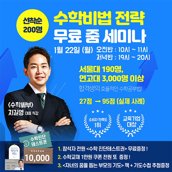 1월 22일(월) 오전 10시, 오후 7시에 진행하며 오전, 오후 각각 선착순 100명, 총 200명 마감이다. 참석자 전원에게는 수학 진단 테스트권과 수학교재 1만 원 쿠폰을 무료로 증정하며 참석자 중 추첨을 통해 차길영 원장의 저서 ‘자녀의 꿈을 돕는 부모의 기도’ 책과 기도수첩을 증정한다.