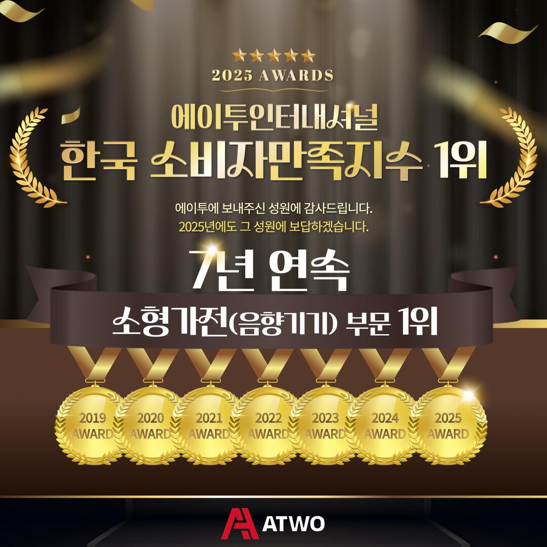 에이투인터내셔널(이하 에이투)은 '2025 한국소비자만족지수 1위' 소형가전(음향기기) 부문에서 7년 연속 수상의 영예를 안았다. 에이투는 소비자들의 꾸준한 신뢰와 사랑을 받아온 결과로, 에이투의 우수한 기술력과 품질을 다시 한번 입증한 쾌거라 전했다.