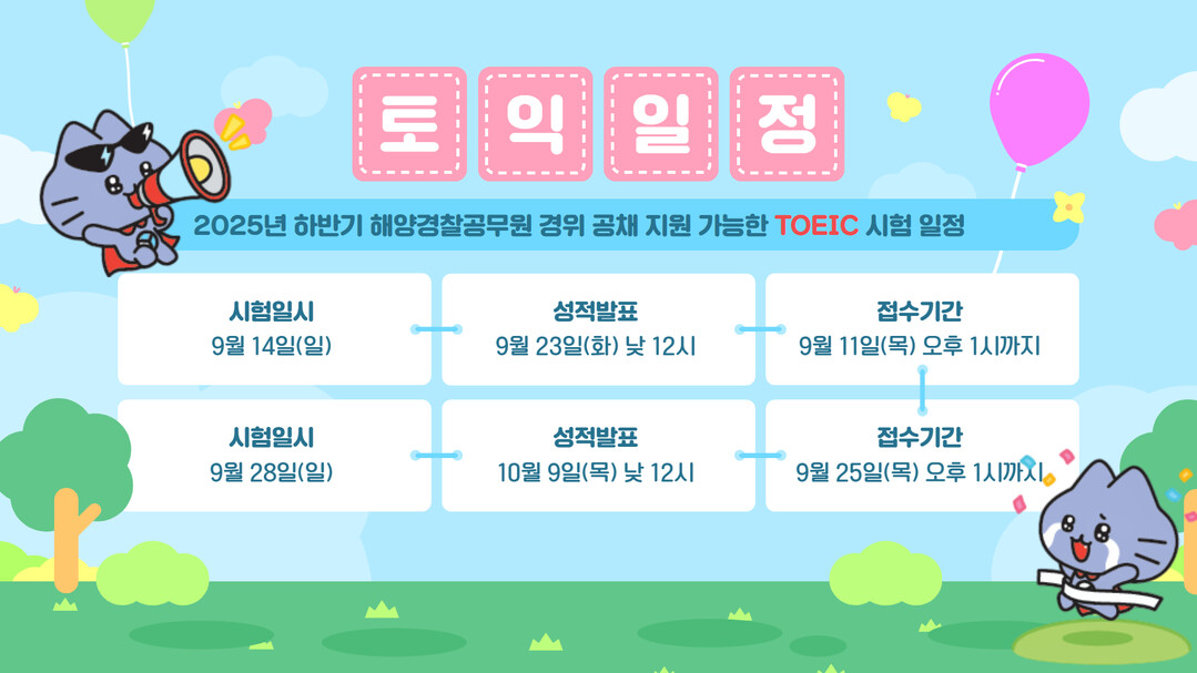 [피앤피뉴스=마성배 기자] 한국TOEIC위원회가 2025년 하반기 해양경찰공무원 경위 공개채용 응시자가 활용할 수 있는 토익 시험 일정을 3일 안내했다.