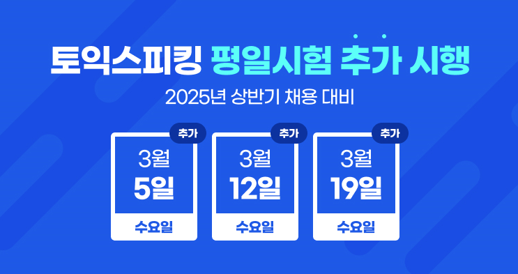 이에 한국TOEIC위원회는 수험생들이 원하는 시험 일정과 장소를 유연하게 선택할 수 있도록 3월 5일(수), 12일(수), 19일(수) 총 세 차례의 평일 시험을 추가로 운영한다. 해당 시험의 성적은 각각 3월 11일(화), 18일(화), 25일(화) 정오에 발표될 예정이다.