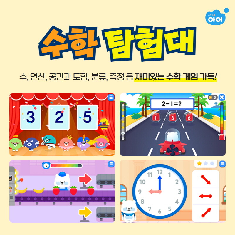 아울러 영역별 게임은 ▲보글보글 바닷속 여행 ▲달려요 연산 레이싱 ▲모양 퍼즐을 맞춰봐 ▲끼리끼리 공장 ▲째깍째깍 시계탑 등 아이들이 좋아하고 친숙한 일상 소재로 만들어져 관심을 끈다.