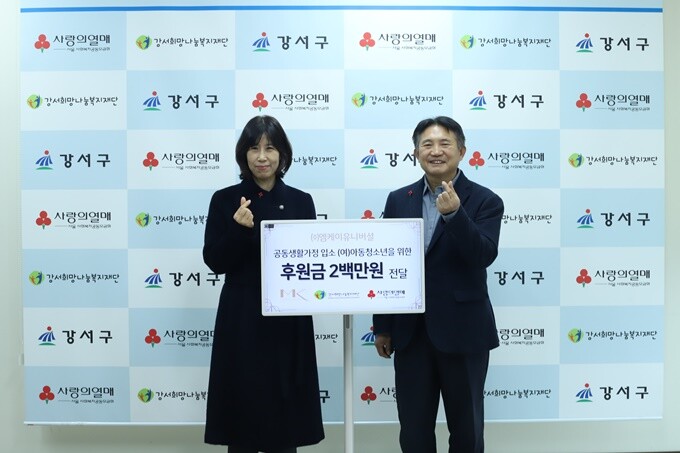 <사진 설명: 뷰티·웰니스 기업 ㈜엠케이유니버셜이 창립 14주년을 기념해 강서구 소외 청소년들에게 후원금을 전달했다.>