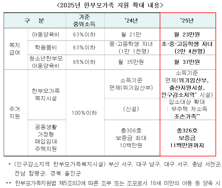올해부터 저소득 한부모가족(중위소득 63% 이하)의 아동양육비 지원금이 기존 월 21만 원에서 월 23만 원으로 인상됐다. 자녀 학용품비 지원도 기존 중·고등학생에서 초등학생까지 확대되며, 청소년한부모(24세 이하, 중위소득 65% 이하) 아동양육비도 월 35만 원에서 월 37만 원으로 상향됐다.