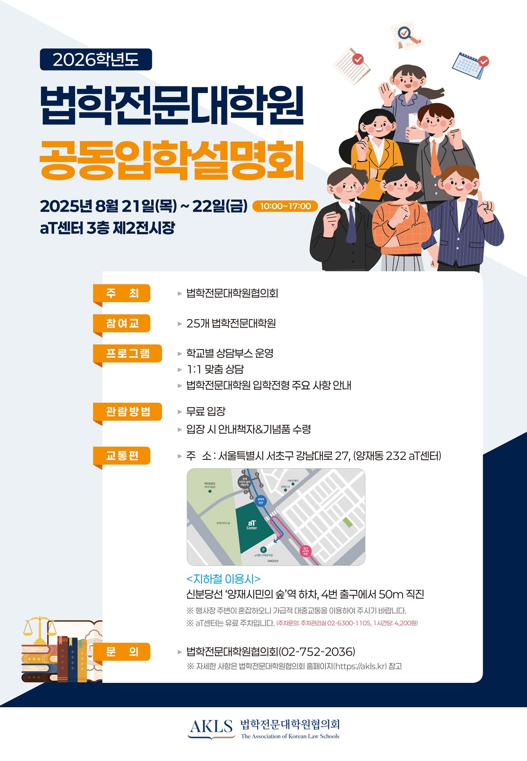 [피앤피뉴스 마성배 기자] 전국의 법학전문대학원(로스쿨) 입학 정보를 한자리에서 만날 수 있는 ‘2026학년도 법학전문대학원 공동입학설명회’가 오는 8월 21일(목)부터 22일(금)까지 이틀 동안 서울 서초구 양재동 aT센터 3층 제2전시장에서 열린다.